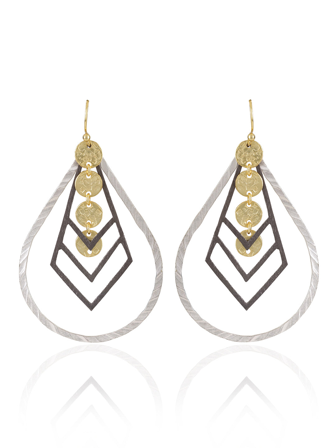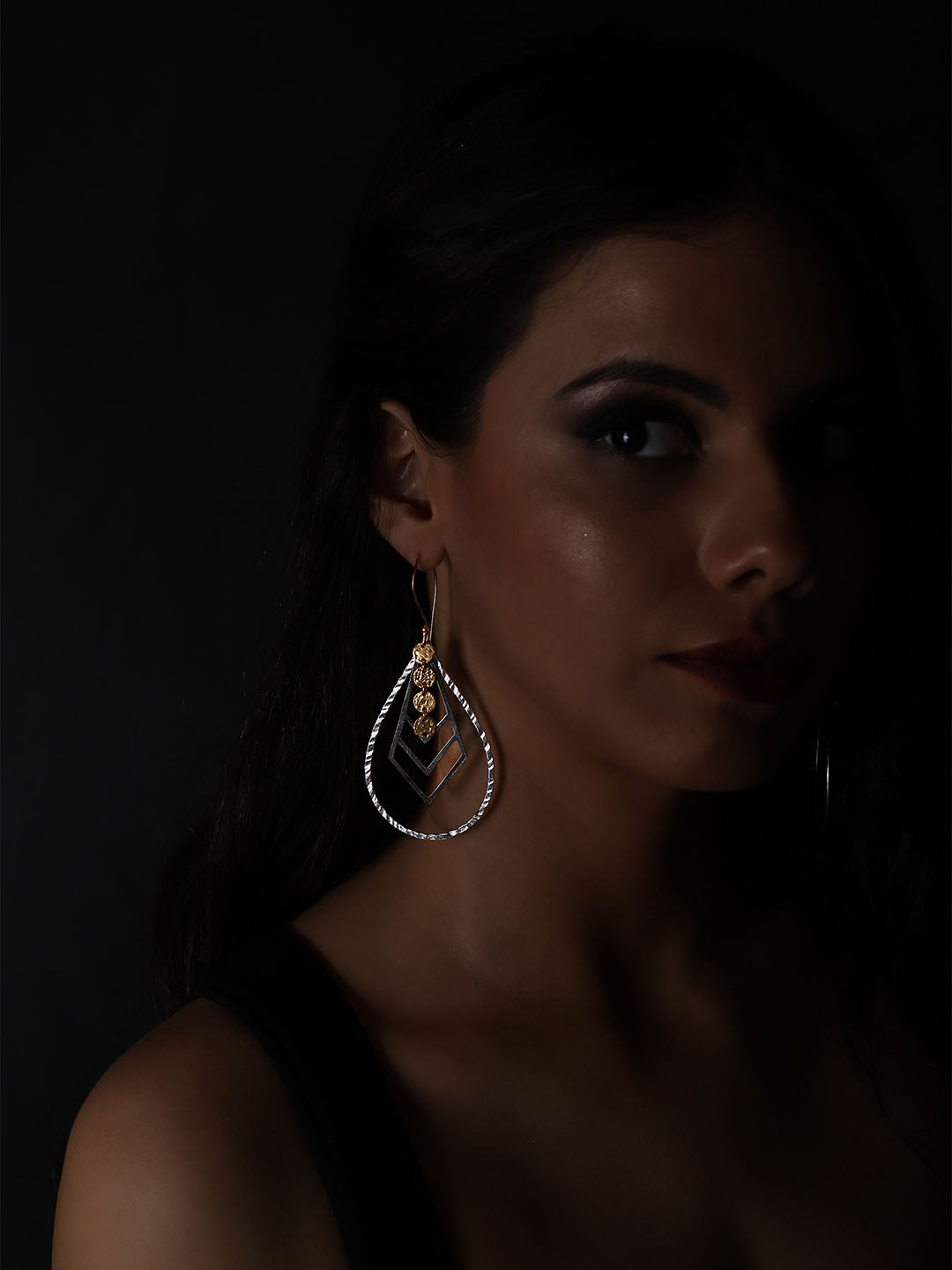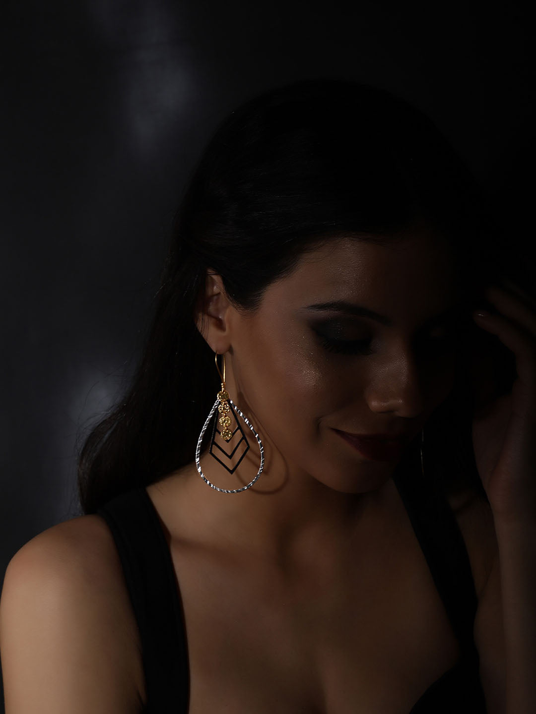 One of our more bold and risque designs, these earrings are here to make a statement. These loops have multiple layers with gold, silver and rhodium plating on different elements in the design which makes them very chic and they make for the perfect accessory to add the final touch to your glam look.